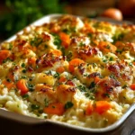 A comforting Chicken and Rice Casserole featuring tender chicken, flavorful vegetables, and creamy rice, perfect for busy weeknights.