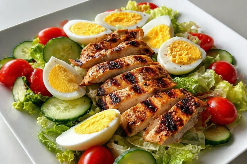 The Grilled Chicken Power Salad is a fantastic choice for anyone looking for a healthy and delicious meal. It’s packed with protein from the chicken and eggs, and it’s loaded with fresh vegetables. This makes it perfect for lunch or dinner when you want something nutritious that still tastes great. The combination of flavors and textures makes this salad satisfying and wholesome.