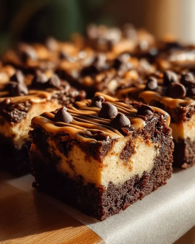 Rich and fudgy brownies with a smooth peanut butter cheesecake layer, perfect for parties or a delicious treat.