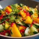 A refreshing salad bursting with the flavors of ripe mangoes, crisp cucumbers, and zesty dressing, perfect as a side or light main course.